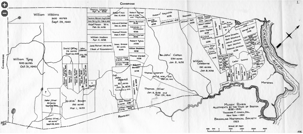 Once part of Algonquian territory, Brookline was first settled by European colonists in the early 17th century. Also The area was an outlying part of the colonial settlement of Boston and known as the hamlet of Muddy River. In 1705, incorporated as the independent town of Brookline. The northern and southern borders of the town marked by two small rivers or brooks, hence the name. The northern border with Brighton (which itself part of Cambridge until 1807) Smelt Brook. (That name appears on maps starting at least as early as 1852, but sometime between 1888 and 1925 the brook was covered over.[2]) The southern boundary, abutting Boston, was the Muddy River.